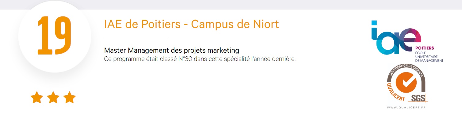 Au sein du Pôle Universitaire de Niort, l’IAE de Poitiers propose en formation initiale ou en formation continue un Master professionnel Management des projets marketing dans le cadre d’un parcours complet de formation en alternance dès la première année.